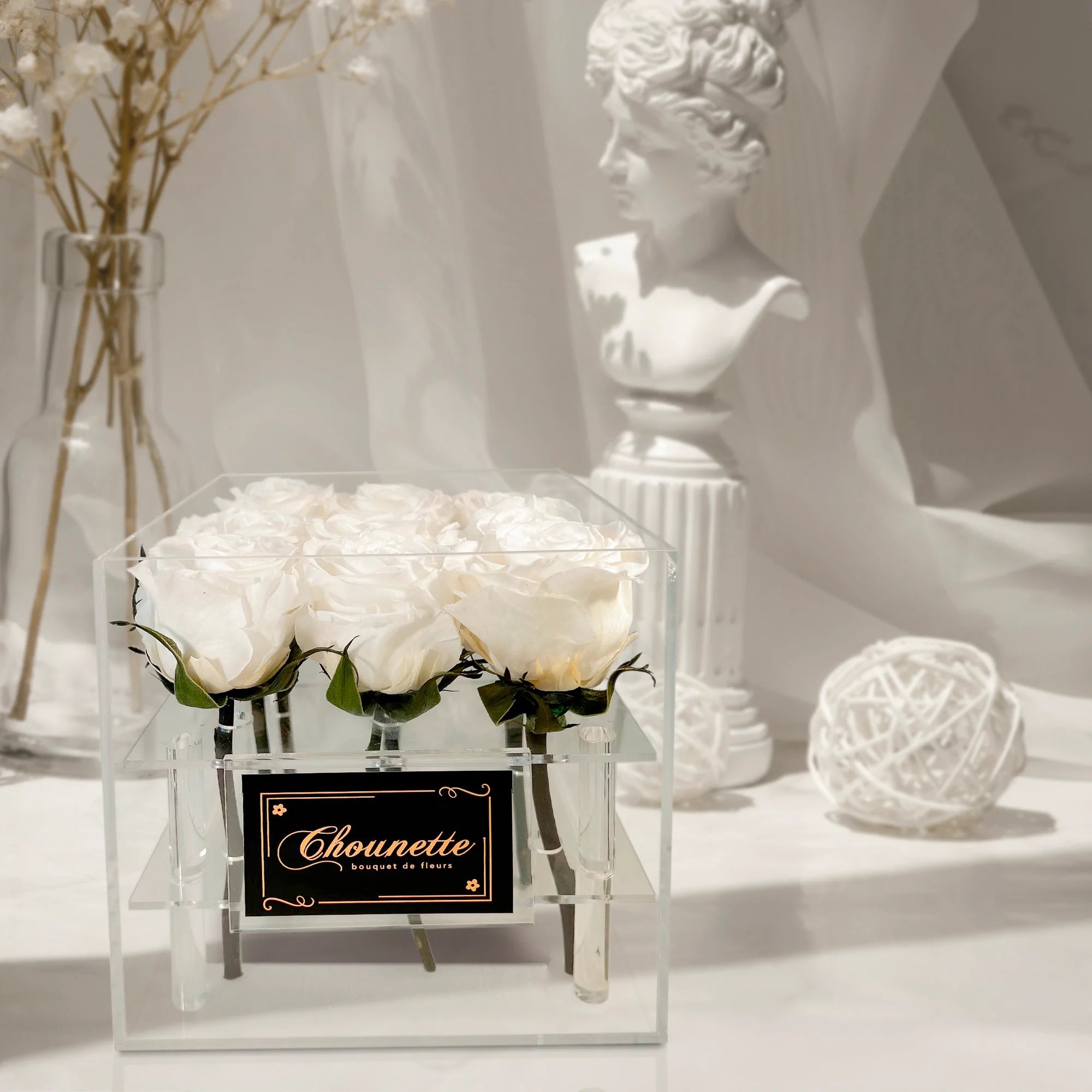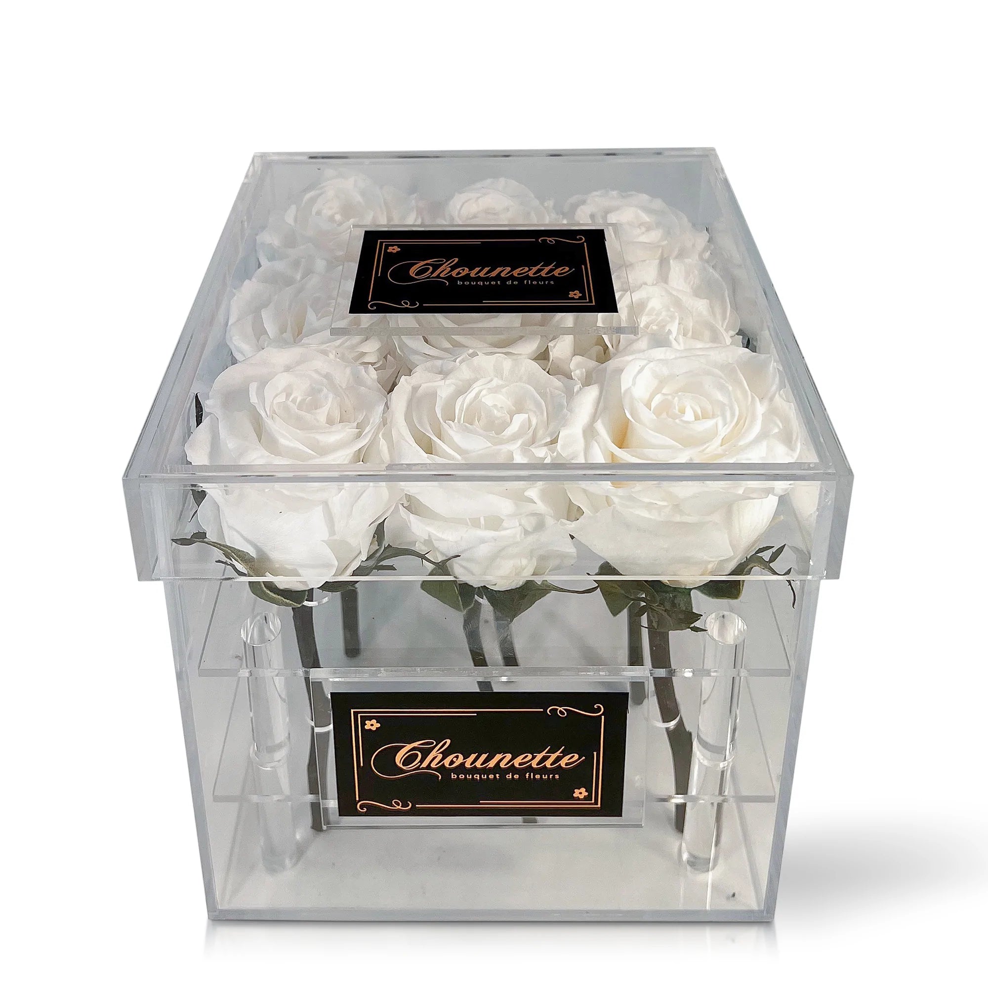 Dazzle your loved ones with 9 beautiful roses, arranged perfectly in our "la Tresor" square clear acrylic box. 9 beautiful roses that will last a whole year. Place them wherever you choose to add a splash of color and light up the ambiance. This lovely arrangement will lighten up any living space in your home